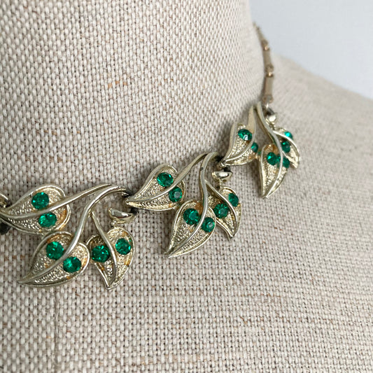 50s Leafy Green Rhinestone Choker, Adjustable Vintage Rhinestone Necklace