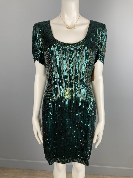 80s Oleg Cassini Black Tie Green Sequinned Party Dress, Size S