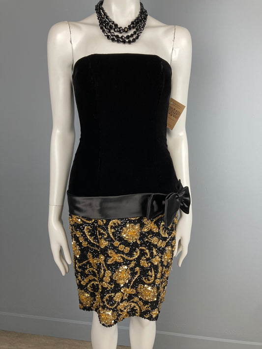 80s Heavily Beaded Silk and Velvet Party Dress, 1980s Black and Gold Party Mini Dress, Size XS