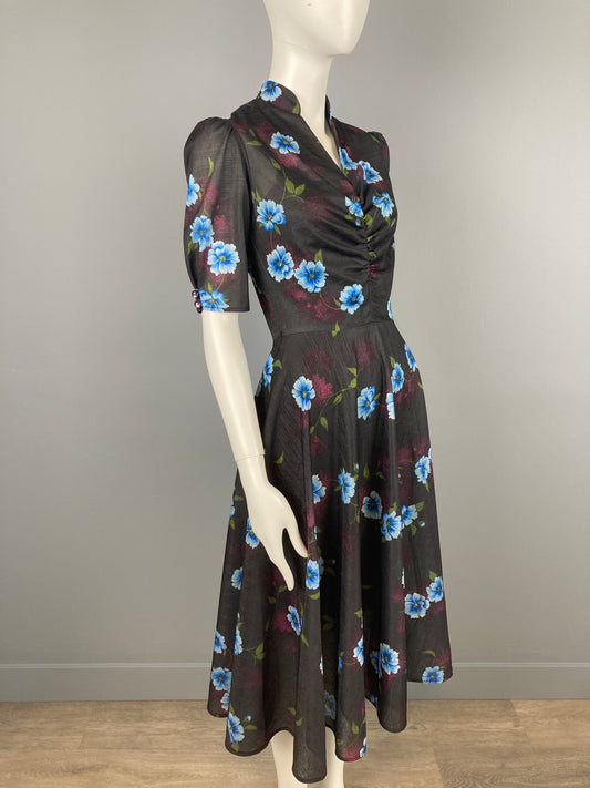 70s Does 40s Semi-Sheer Floral A-Line Day Dress, Size S