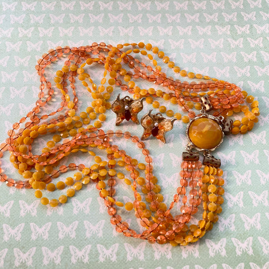 60/70s Mode Art Butterfly Earrings and Coordinating Orange Tone Multi-strand Necklace