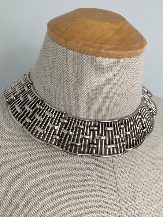 70s Trafari Wide Silver Collar Necklace, Egyptian Style Adjustable Necklace, 70s Modernist Style Chunky Collar Necklace