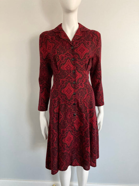 80s does 40s Peplum Dress with Jacquard Floral Design and Bow, Size M