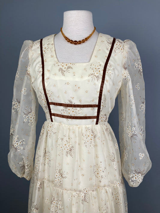 1970s Flocked Prairie Style Maxi Dress, Size S/M, Boho Wedding Dress
