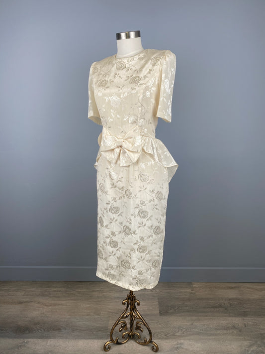 80s does 40s Peplum Dress with Jacquard Floral Design and Bow, Size M