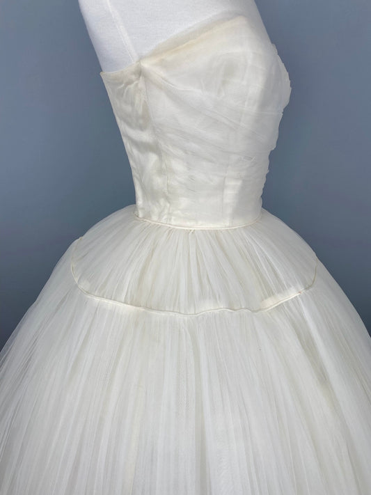 50s Micro-Pleated White Tulle Dress, Vintage White Tulle Wedding Dress, Size XS