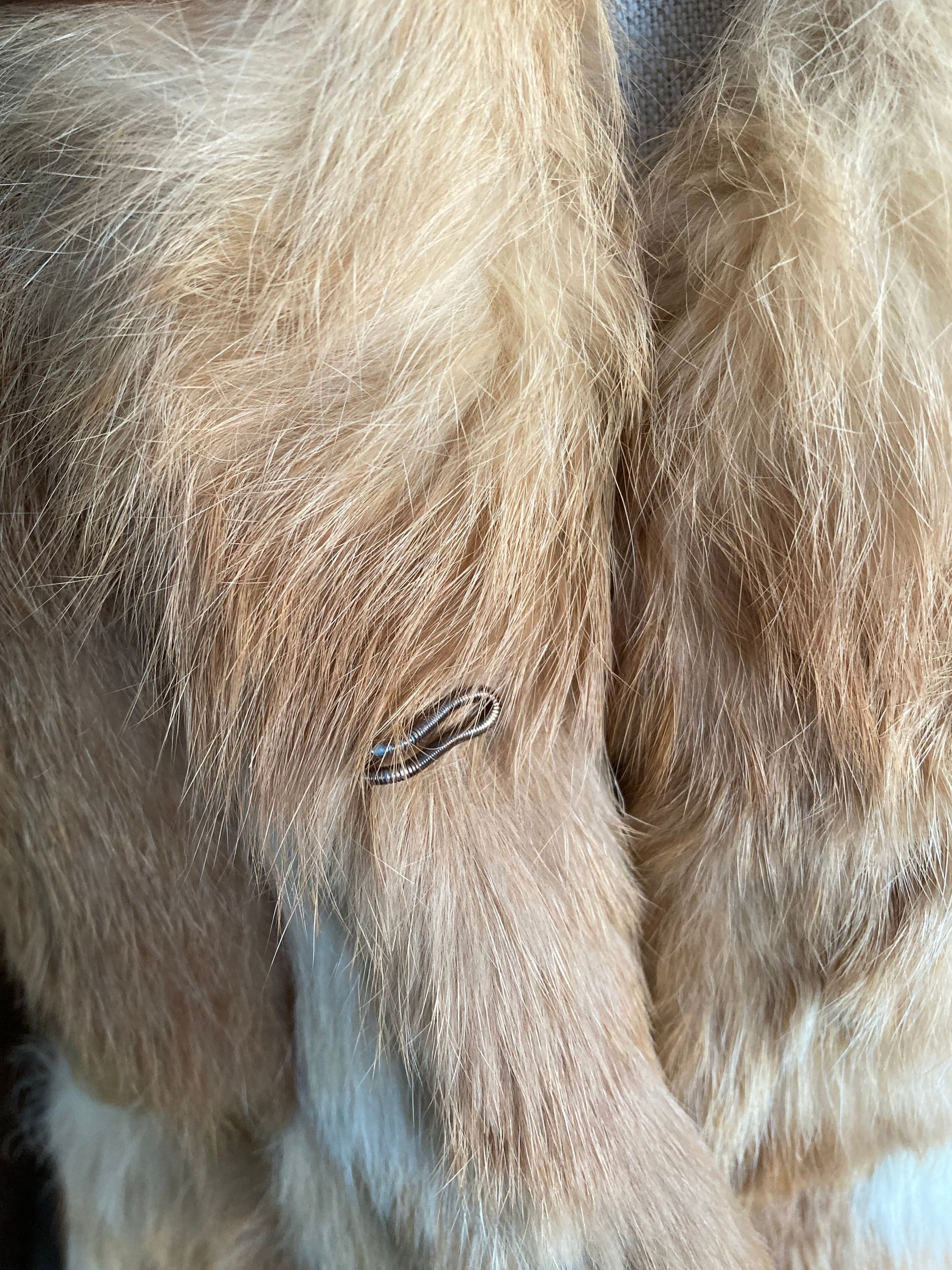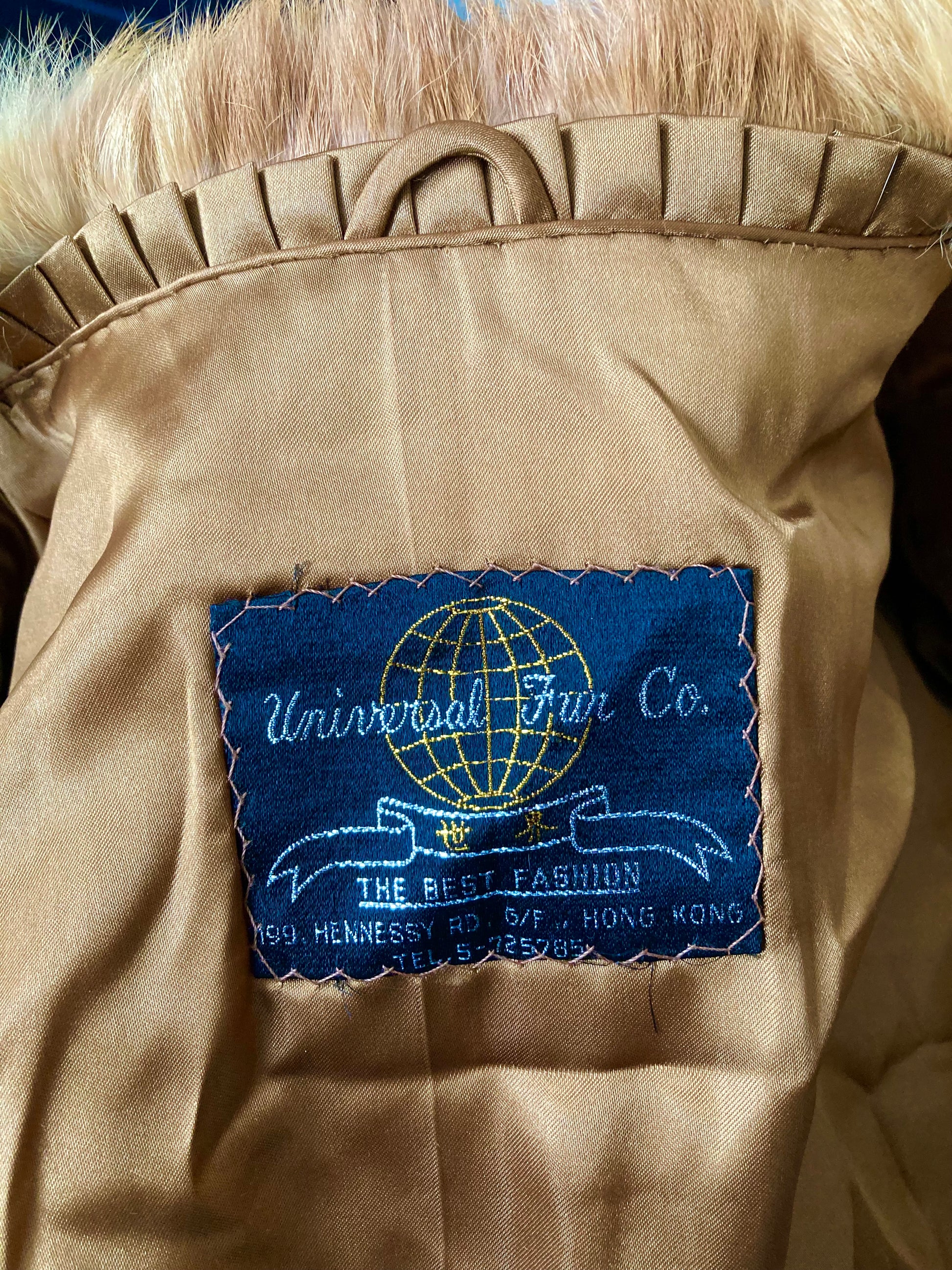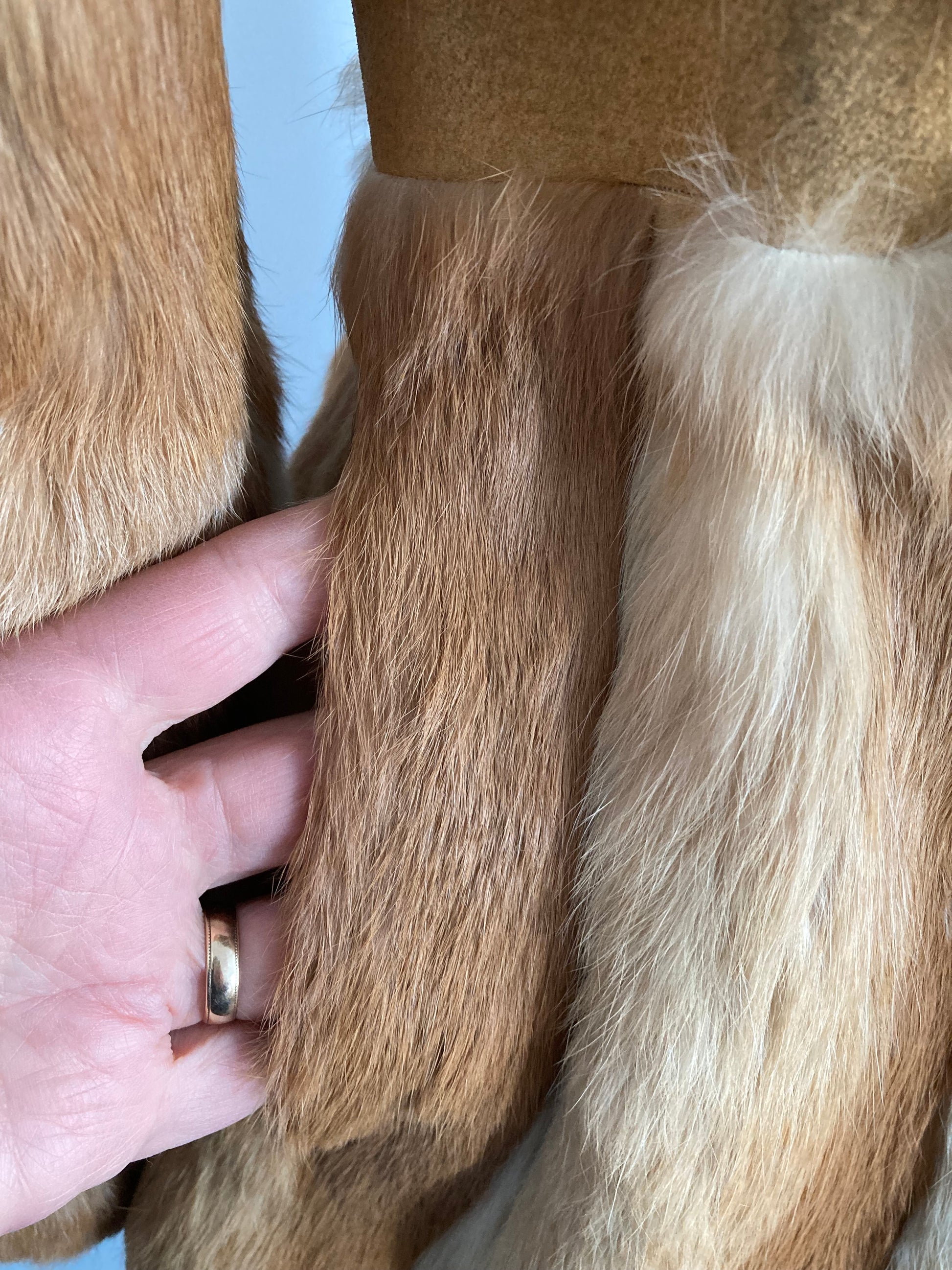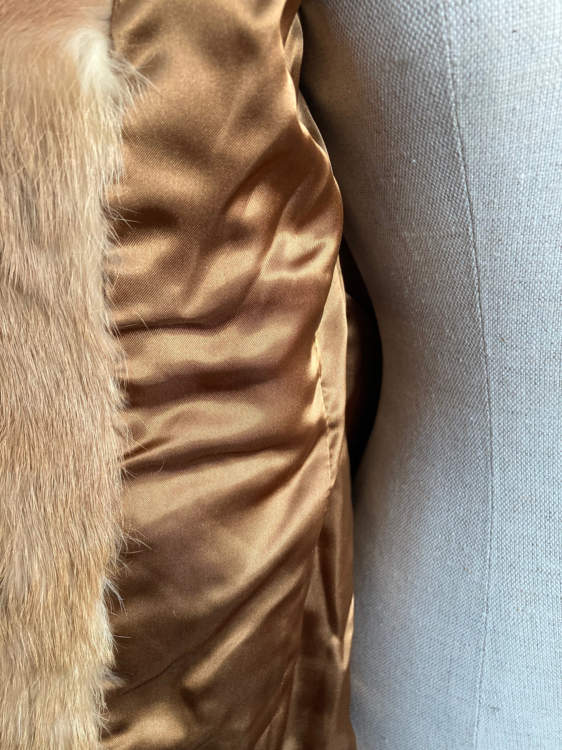 Incredibly soft and cozy 1970s rabbit fur jacket in soft tones of brown and cream. It has gorgeous gold lining and is in very good condition with almost no signs of ever being worn. Closes with two fur hooks on the front. Super cute styling with big collar, side pockets and generous sleeves. Suede waistline definition. Made in Hong Kong.