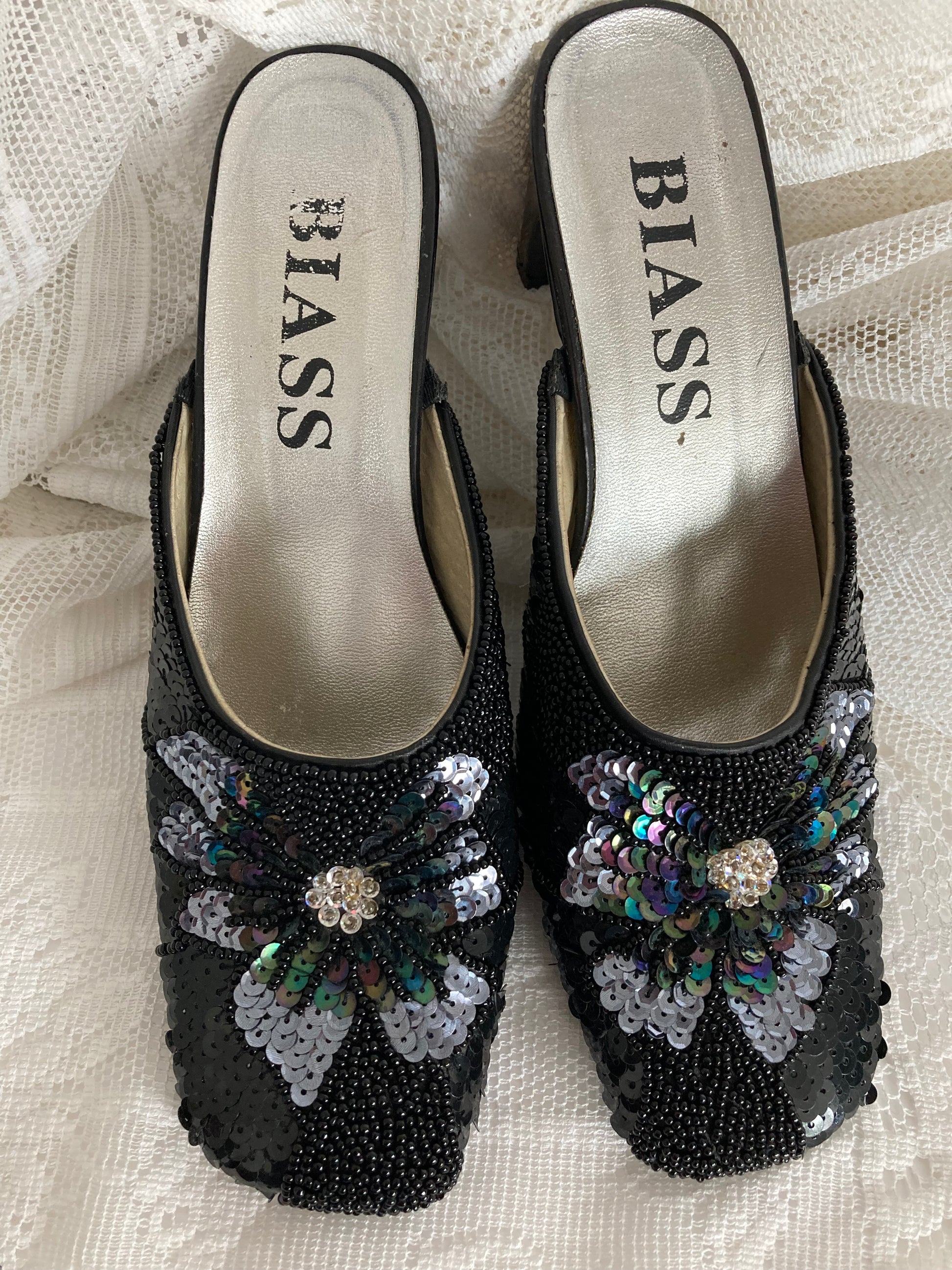 Super cute 90s party/evening slide heels with beading and sequins on the toe and black patent heels. The inside of the shoe is soft leather, the beadwork is expertly done and the bottom is marked VERU CUOIO Size 37 which would indicate that they are a very nice quality made in Italy. Size 37 in Canadian sizing would be 6.5/7. Toe box is 2.25 inches across, top of the vamp to toe is 3.5" and 5.5" across. They are in very good condition with very little signs of wear.