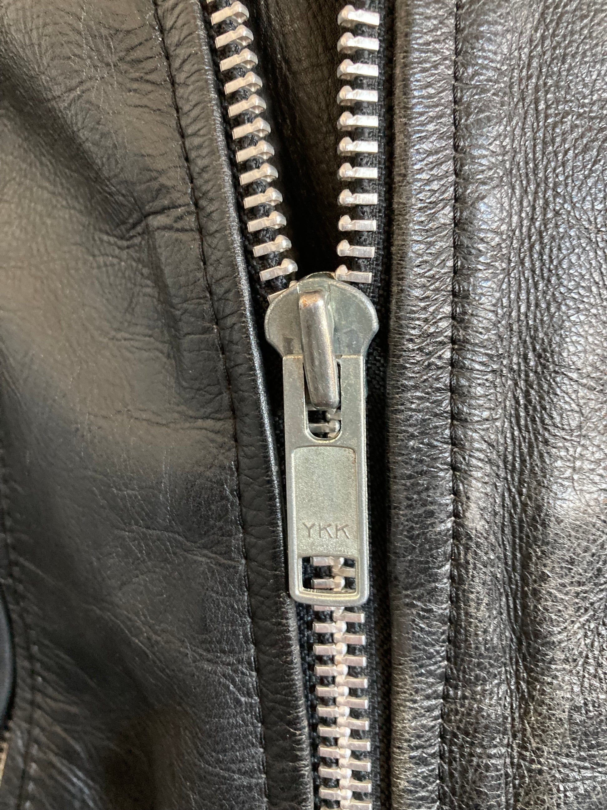 conic vintage black leather biker jacket with heavy zippers, lace up sides and waist belt. Lots of style and attitude, worn in to perfection. I actually purchased this jacket from an older woman who wore it in her youth. It works well for a female form as well as it's quite cropped and the laces at the side allow it to be nipped in at the waist.