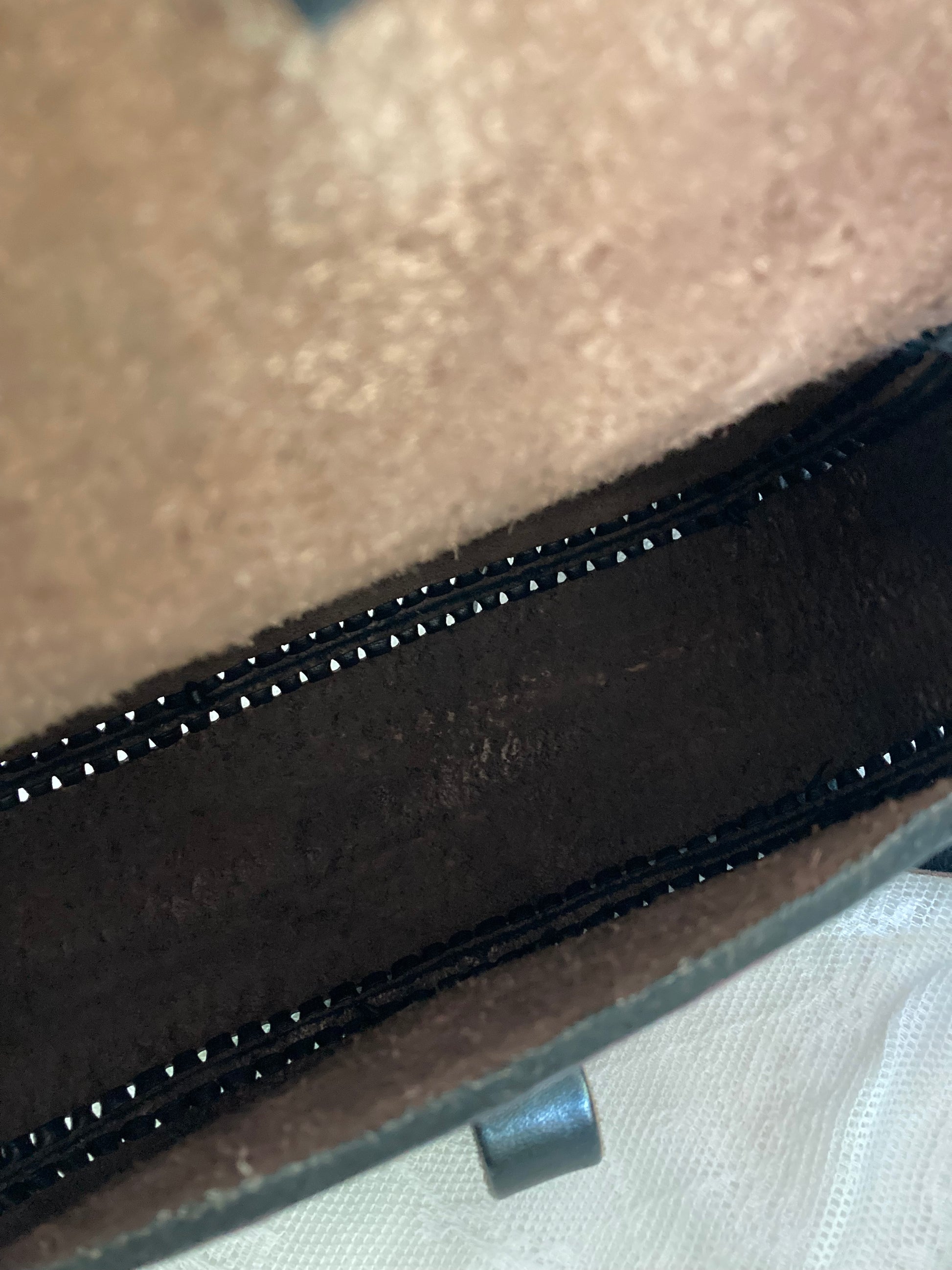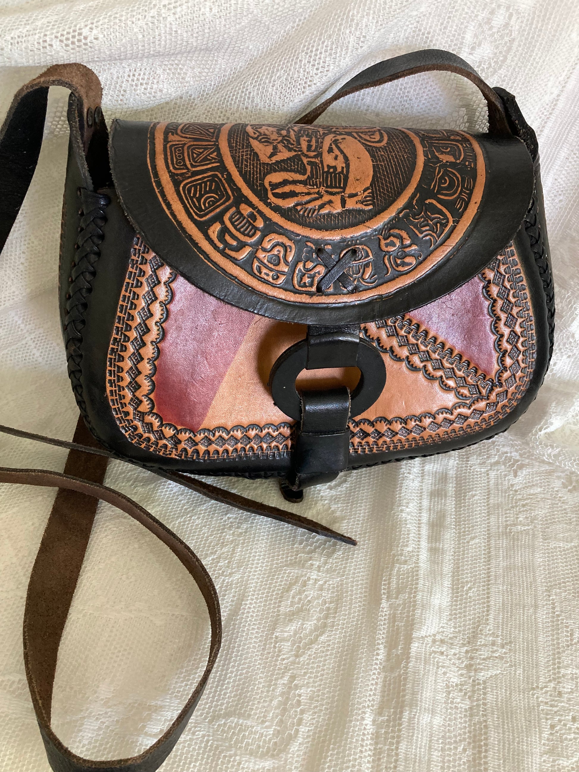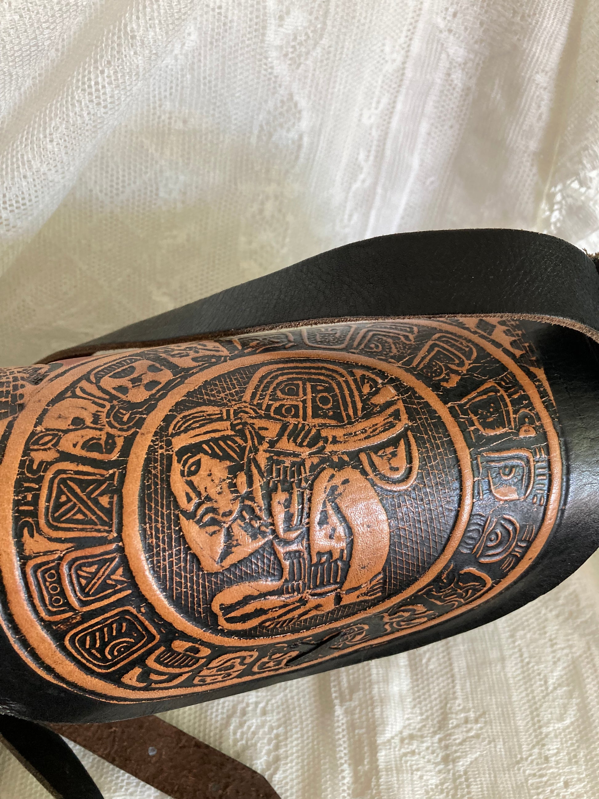 Boho style mexican leather shoulder bag in black with earthy accent colours of burgundy and caramel brown. Thick sturdy construction of genuine tooled leather depicting an ancient Meso-American calendar decorates the top flap. Extra long shoulder strap can also be worn dross body. One single compartment with no divisions inside. It is in excellent, clean condition.