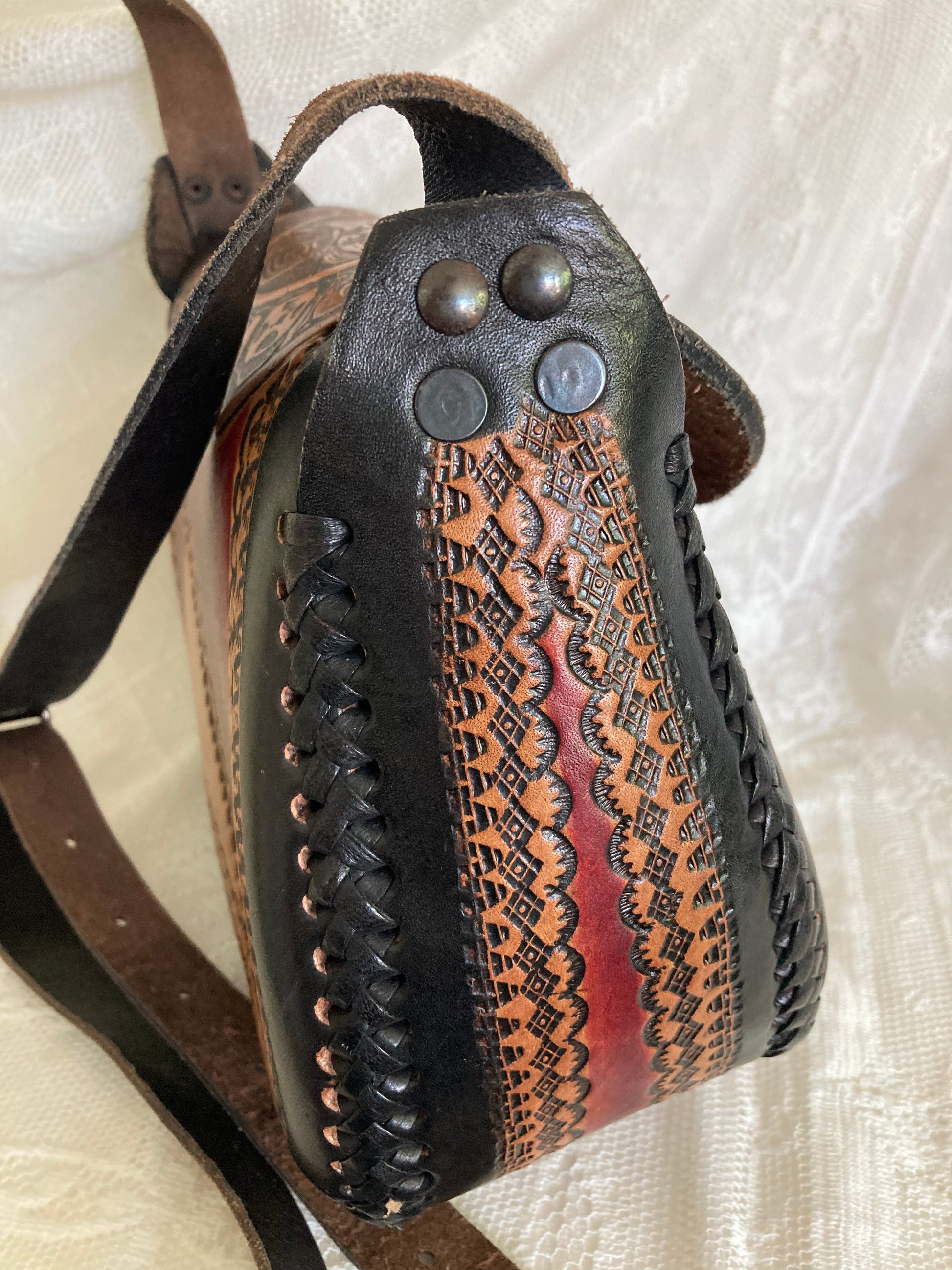 Vintage Mexican Leather Shoulder Bag, Black Burgundy and Brown Purse