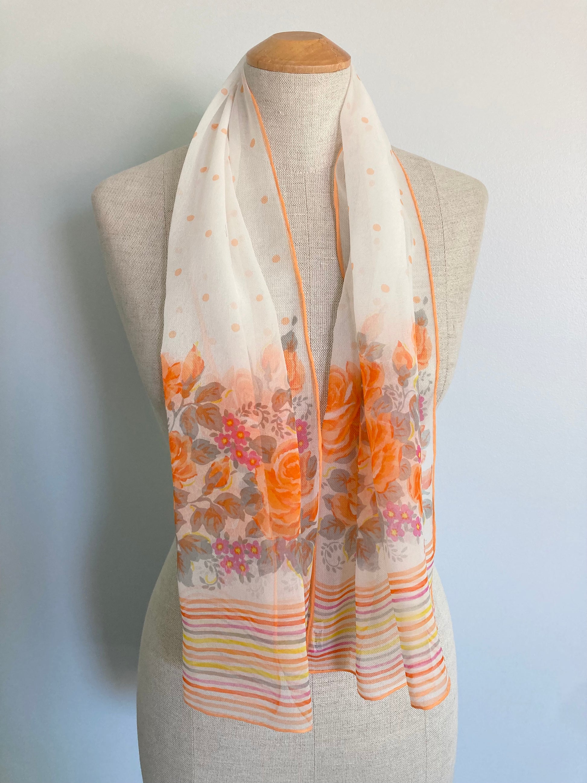Lovely printed chiffon summer scarf by Burmel. Pretty tangerine roses with pink accents and delicate stripes and dots. Lots of ways to wear this shape of scarf to add a pop of colour to your outfit and style it up just a bit. Made in Japan using a very fine synthetic called Vinal, this scarf is a quality made item as shown by its carefully hand rolled edges. Size is 46.5" X 13". it is in very good, clean condition and is ready to wear.